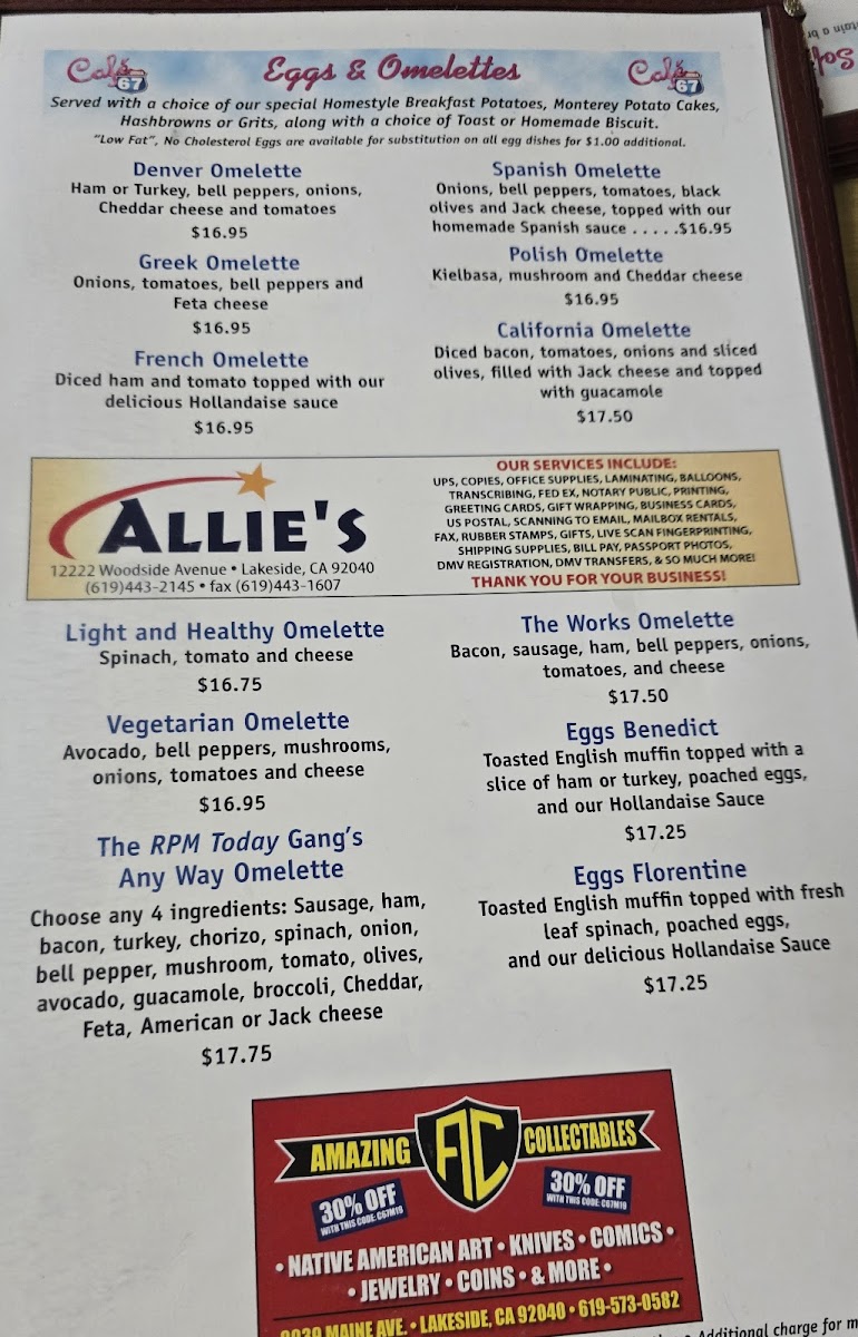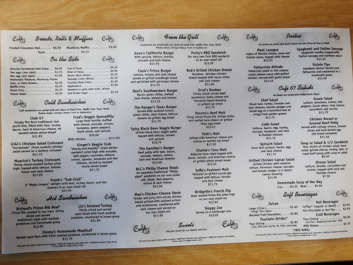 Nestled in the heart of Lakeside, CA, Cafe 67 presents a menu that delights breakfast lovers and lunch enthusiasts alike. With a commitment to quality and friendly service, guests are welcomed to explore an array of mouthwatering options that cater to all appetites.